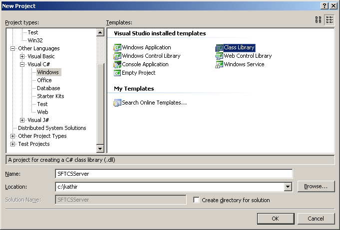 Open your visual studio 2005 or 2008 or 2010 IDE and create a C# project - Class Library. so that the output would be a DLL. I have named the C# class library project as SFTCSServer.