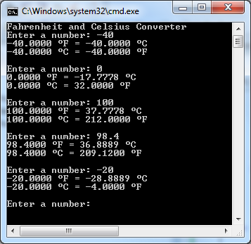 D:\Program Files\Java\jdk1.6.0_23\bin>java FahrenheitCelsiusConverter