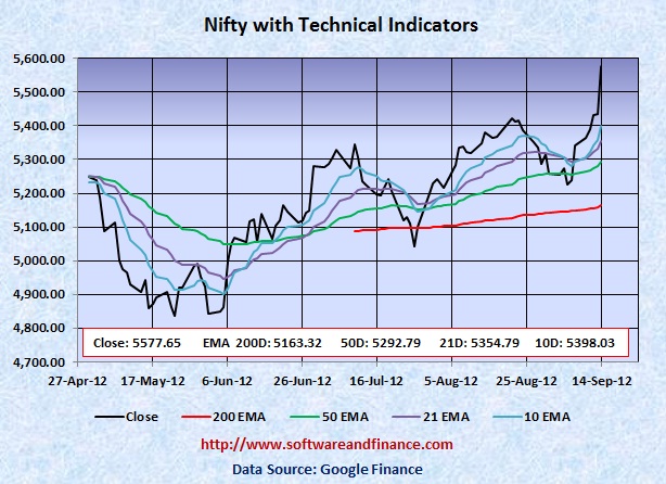 Sep 14, 2012 - Nifty closed today at 5577.65 which is about 255 points up from the last week close of 5342.10 on Sep 07, 2012. Nifty was trading between 5322.10 and 5586.65 that is the swing of about 255 points.