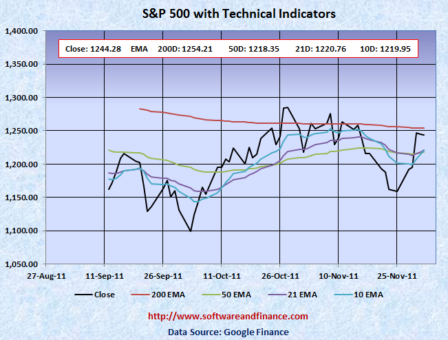 Dec 02, 2011 - S&P 500 closed today at 1244.28 which is 86 points (7.18%) up compared to last week close of 1158.67 on Nov 25, 2011. S&P 500 was trading between between 1158.67 and 1260.08.