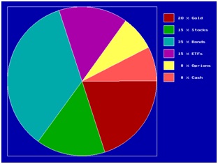 A pie chart showing the portfolio of Gold, Stocks, Bonds, Options, ETFs and Cash with different colors.